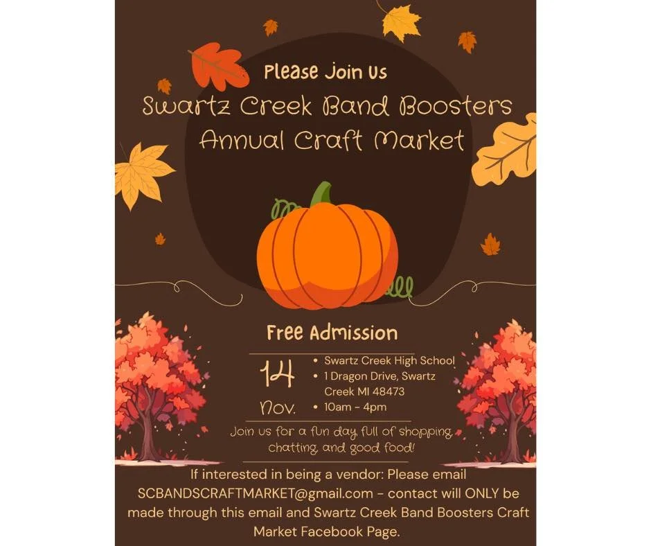 Swartz Creek Band Boosters Annual Craft Market Saturday, November 14, 2026 10:00 AM 4:00 PM Swartz Creek High School 1 Dragon Drive Swartz Creek, MI, 48473 (map) Google Calendar ICS Sergeant Suds Laundry PowderSwartz Creek Ban Market - September 24, 2026Offering an All-Natural 5-Ingredient Safe Laundry Detergent!10% of All Sales Donated to local Veteran events! Swartz Creek High School Map - Band Booster Craft Market event